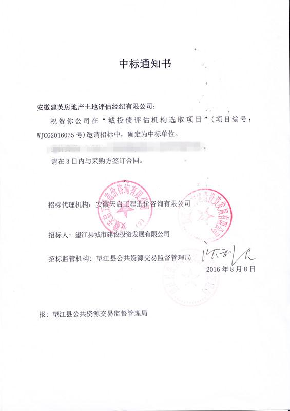 2016年8月,公司中標(biāo)望江城市建設(shè)投資發(fā)展有限公司招標(biāo)的“城投債評(píng)估機(jī)構(gòu)選取項(xiàng)目”。