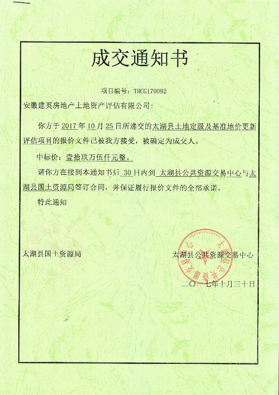 2017年10月,公司中標(biāo)太湖縣土地定級(jí)及基準(zhǔn)地價(jià)更新評(píng)估項(xiàng)目。