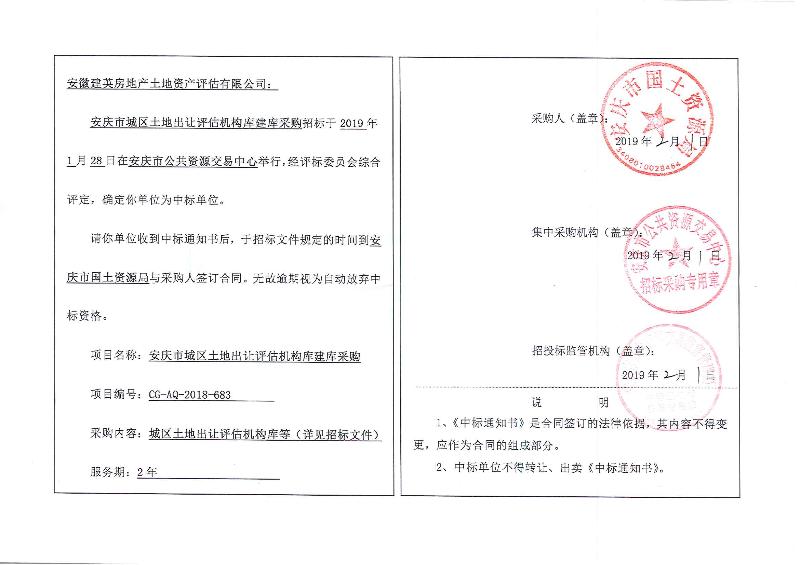 2019年2月,公司中標(biāo)安慶城區(qū)土地出讓評估機(jī)構(gòu)庫入庫。本次中標(biāo)服務(wù)期限為2年。