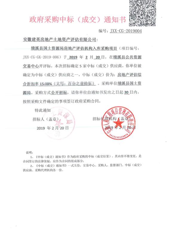 2019年2月,公司中標(biāo)績(jī)溪縣國(guó)土資源局房地產(chǎn)評(píng)估機(jī)構(gòu)入庫(kù)采購(gòu)項(xiàng)目,本次中標(biāo)服務(wù)期限為3年。