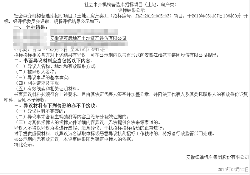 2019年3月,公司中標(biāo)江淮汽車2019-2020年度資產(chǎn)評(píng)估備選庫(kù),本次中標(biāo)服務(wù)期限為2年。