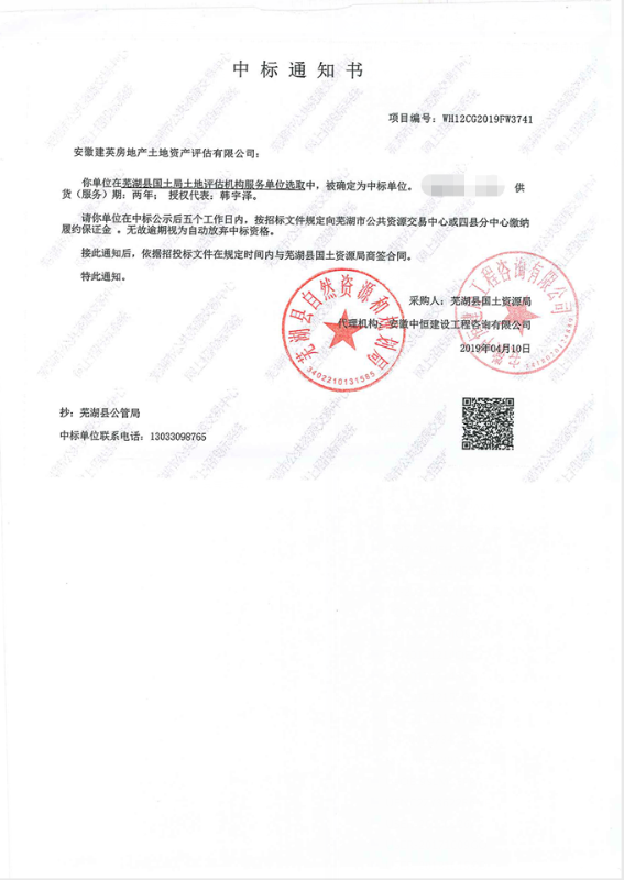 2019年4月,公司中標(biāo)蕪湖縣國(guó)土局土地評(píng)估機(jī)構(gòu)服務(wù)單位選取,本次中標(biāo)服務(wù)期限為2年。
