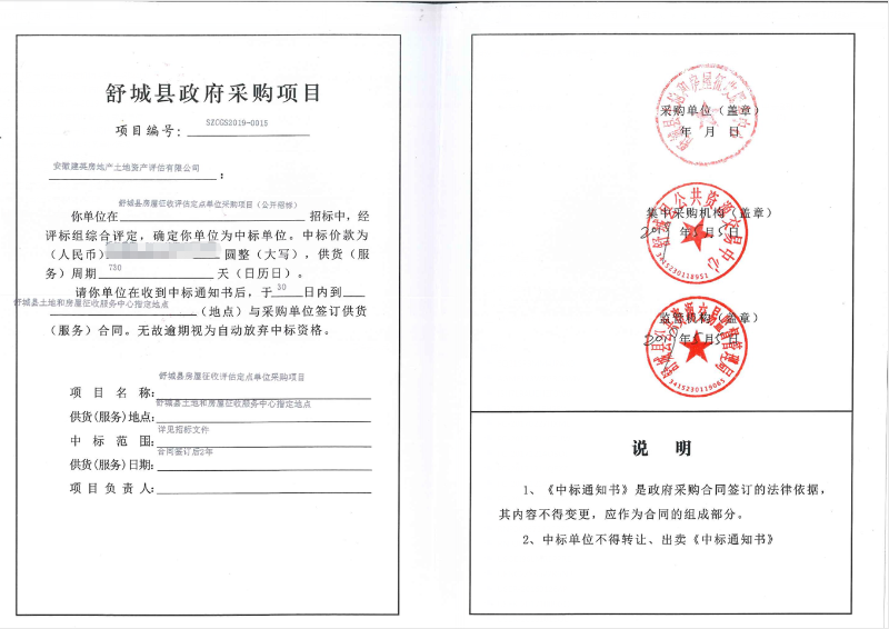 2019年5月,公司中標舒城縣土地和房屋征收服務中心,本次中標服務期限為2年。