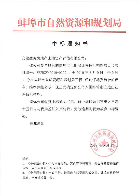 2019年5月,公司再次入圍蚌埠市土地出讓評(píng)估機(jī)構(gòu)庫項(xiàng)目