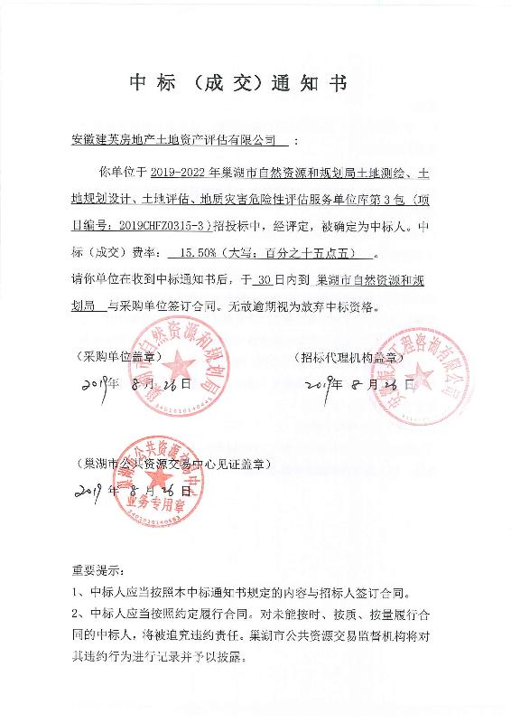 2019年8月,公司入圍巢湖市自然資源和規(guī)劃局土地評估服務(wù)單位庫
