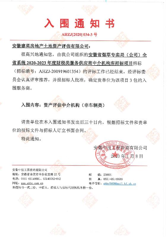 2020年1月8日,公司入圍安徽省煙草專賣局(公司)全省系統(tǒng)2020-2023年度財(cái)稅類服務(wù)供應(yīng)商中介機(jī)構(gòu)庫(kù)