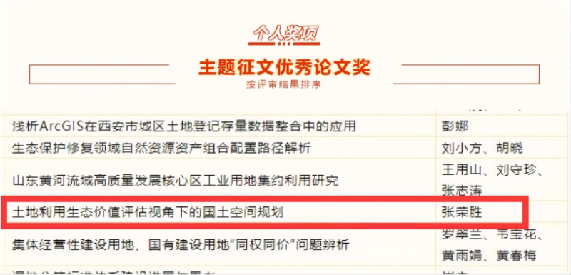 此次獲獎(jiǎng),?是對(duì)我司長(zhǎng)期以來致力于土地估價(jià)行業(yè)創(chuàng)新發(fā)展、?積極推動(dòng)土地估價(jià)報(bào)告電子化備案工作的高度認(rèn)可,?也是對(duì)我司積極參與社會(huì)公益活動(dòng)、?踐行企業(yè)社會(huì)責(zé)任的充分肯定。?特別是在主題征文活動(dòng)中,我司員工?張榮勝提交的論文《土地利用生態(tài)價(jià)值評(píng)估視角下的國(guó)土空間規(guī)劃》,?脫穎而出,?榮獲優(yōu)秀論文二等獎(jiǎng),?展現(xiàn)了我司在專業(yè)領(lǐng)域的研究深度與廣度。?